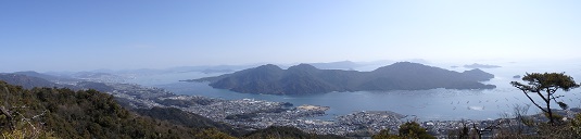 急坂がやっと終わり尾根の分岐点に着きました。頂上まではもう少しのようです。なだらかな登山道を少し行くと木の階段があり、それを上ると東屋がありました。ここからの眺めは絶景です。宮島他瀬戸内に浮かぶ島々がよく見えます。よく見ると厳島神社の大鳥居も見えました。