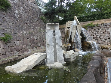 福山城の東側に向かいます。本来の内堀は埋められ内堀を模した親水公園になっています。この辺りの石垣は空襲で焼けたため赤茶け、角が取れて丸くなったものもあります。 東揚楯御門跡を通り、水野勝成の像を見に行きました。水野勝成は初代福山藩主で福山城を完成させ、城下町を整備するなど今日の福山の礎を築いた人物です。