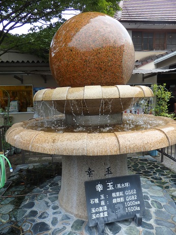 美川ムーバレーを後にして、次の目的地に向かいます。途中道の駅「ピュアラインにしき」に買い物とトイレのために寄ります。駐車場は車で一杯です。夏休み最後の日曜日の行楽の人でしょうか。道の駅の建物の前に石でできた不思議なオブジェがあります。「幸玉」と「幸輪」どちらも水の力で回っています。